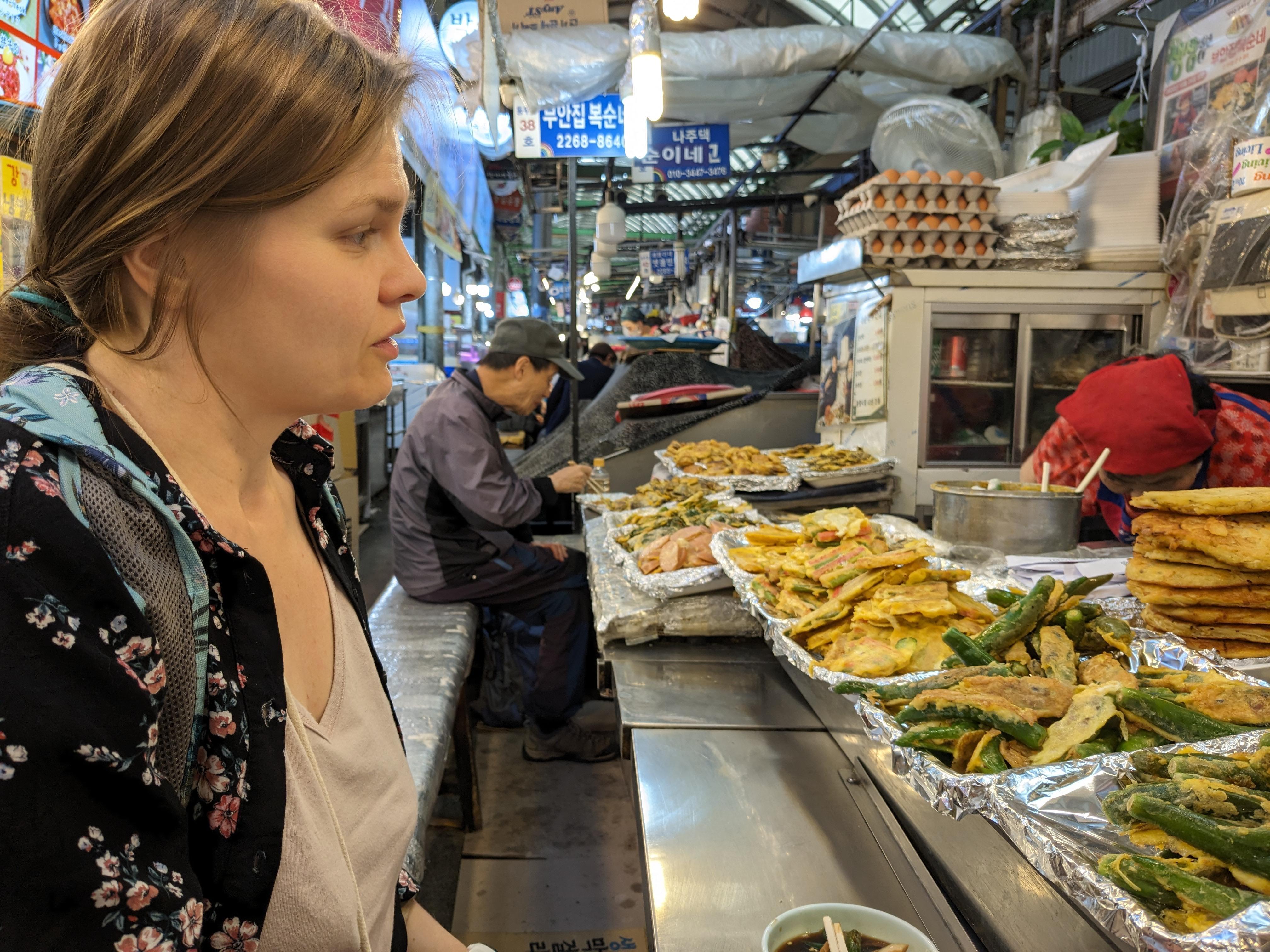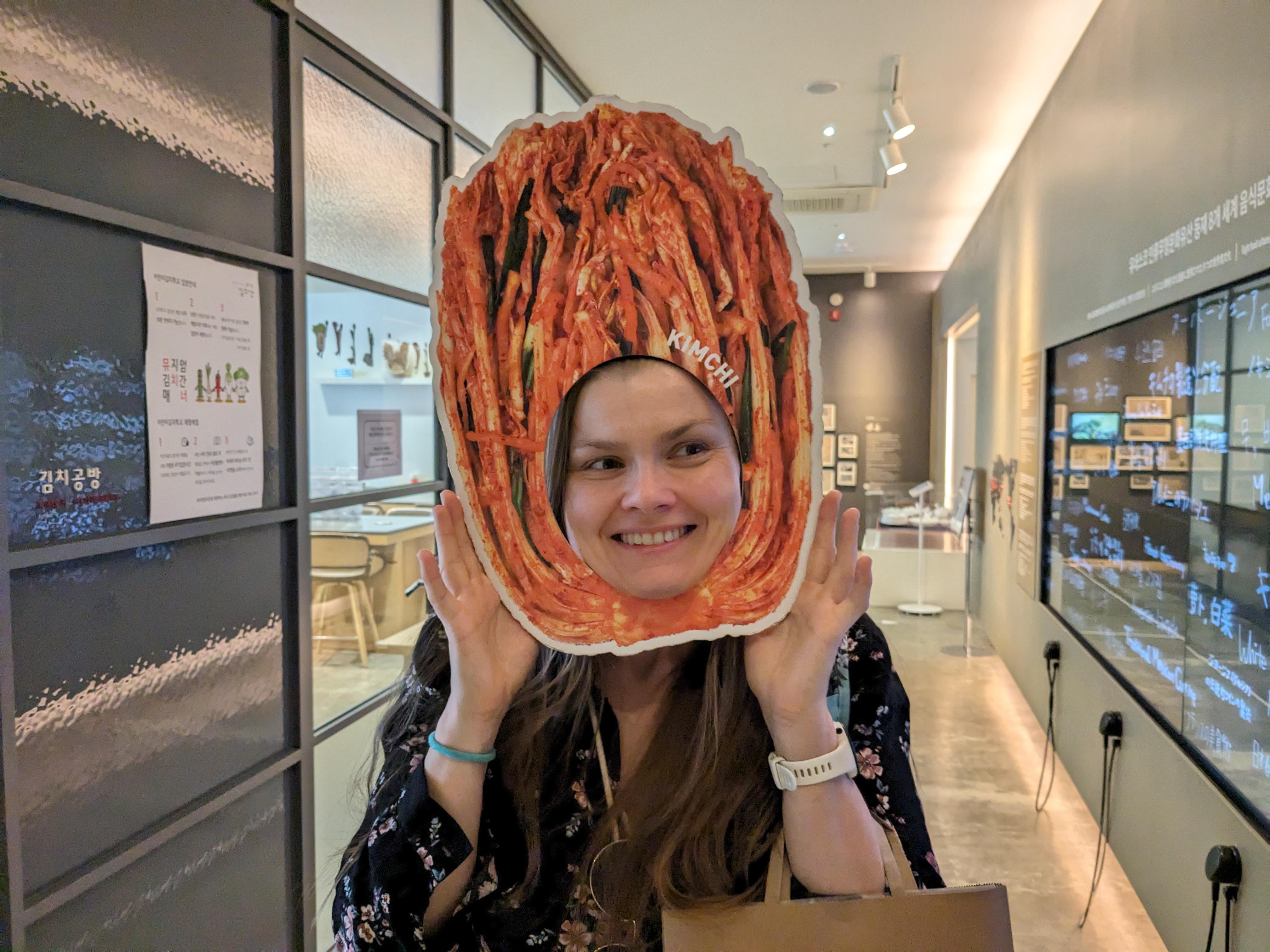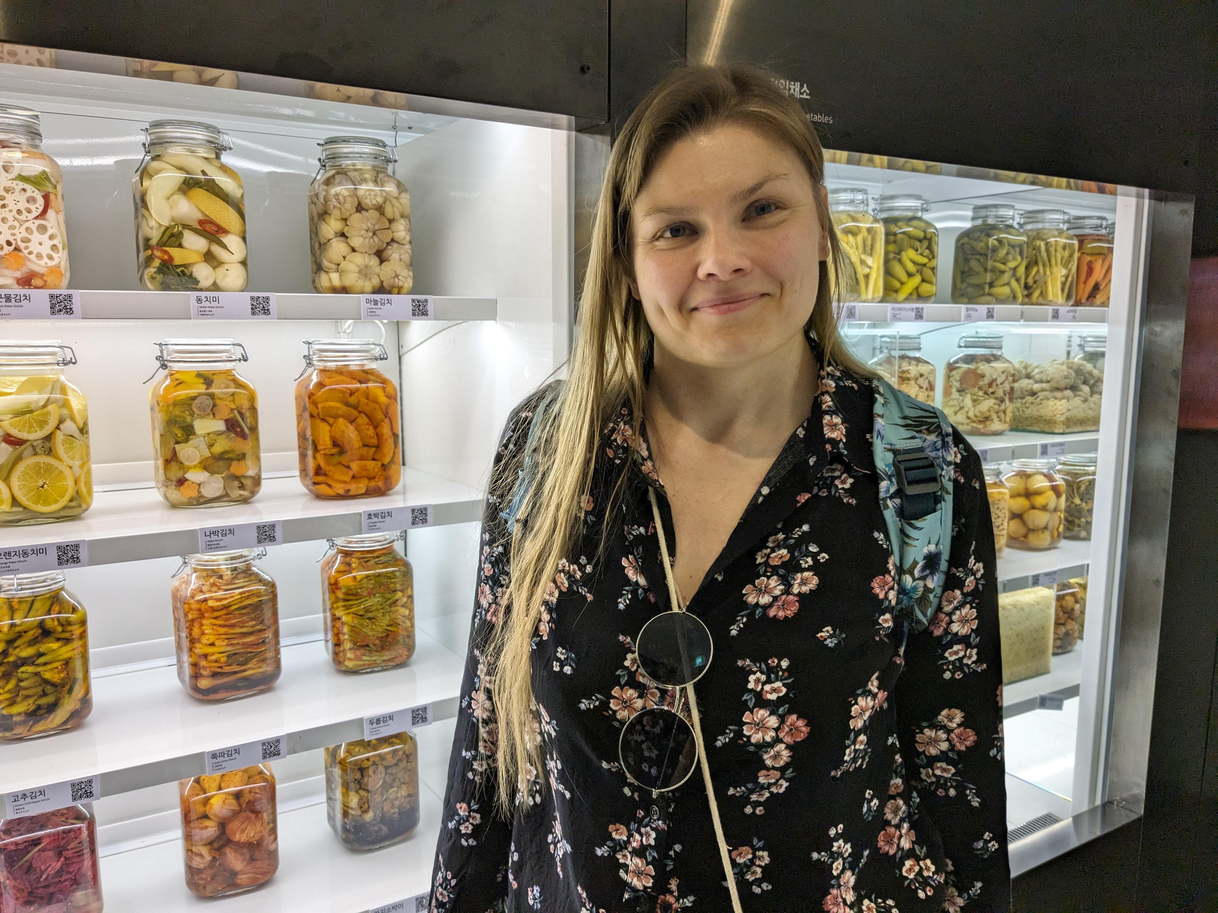 In front of different kinds of kimchi